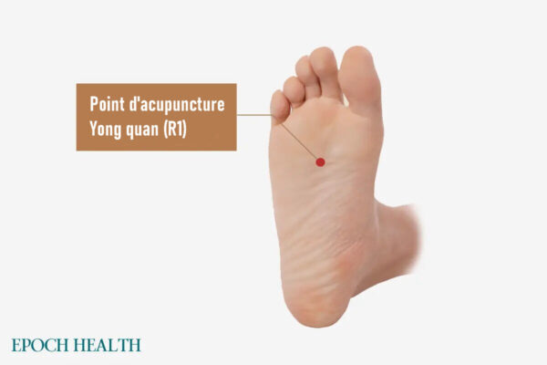 Instructions : saisir le dessus du pied avec quatre doigts, puis appuyer sur le point Yongquan avec le pouce tout en effectuant des cercles et des massages. Cette technique peut aider à soulager la fatigue des reins.