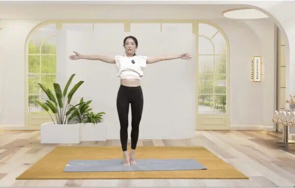 Étape 1 : se tenir debout sur la jambe droite et soulever la jambe gauche de façon à ce que la cuisse soit parallèle au sol.
