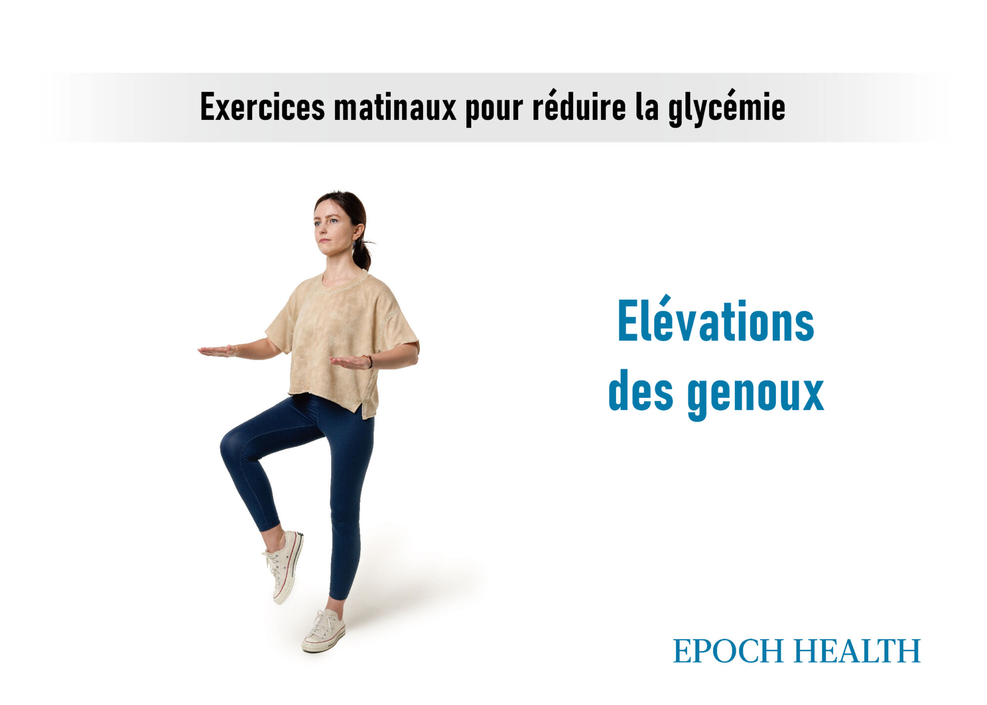 Étape 2 : En gardant le dos droit, lever une jambe jusqu’à ce que le genou touche la paume de la main, puis la redescendre. Répéter l’opération de l’autre côté, en prenant une seconde pour chaque mouvement.