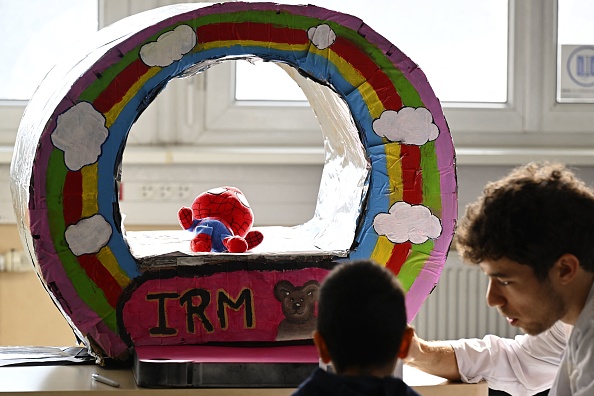 « Je suis Lola et je suis nounoursologue. Pourquoi ton nounours vient voir le médecin aujourd’hui ? », interroge une étudiante. « Il a mal ici », répond Youssouf, 5 ans, en montrant la patte de sa vache en peluche baptisée « Boug ». Consciencieux, le petit garçon a amené le carnet de santé de l’animal, qui y apparait dessiné, avec son âge (4 ans) et sa taille (25 centimètres). Entorse ou patte cassée ? Pour vérifier, direction l’IRM. Sur une image en noir et blanc la fracture est visible; un passage par le bloc opératoire s’impose.
