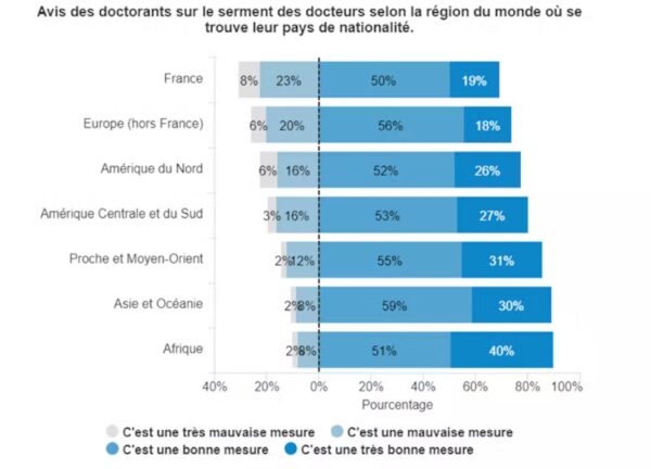 Les doctorants étrangers sont nettement plus favorables à ce serment que les étudiants français, avec des taux qui vont de 74% d’avis favorables pour les étudiants européens jusqu’à 91% pour les étudiants africains. La majorité d’entre eux estime aussi que le serment des docteurs pourra avoir un effet bénéfique sur l’image de la science française à l’étranger, particulièrement les ressortissants de pays d’Amérique du Nord (59%), du Proche et Moyen Orient (61 %) ou d’Afrique (63%).