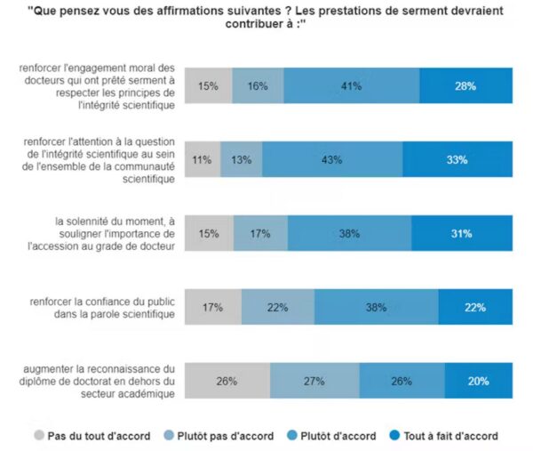 Elle révèle aussi un niveau d’adhésion très fort à ce nouveau serment. Un peu plus de 73% des doctorants et 67% des encadrants qui ont répondu à l’enquête en ont une opinion favorable ou très favorable.