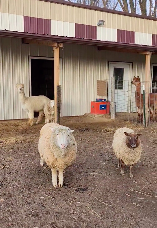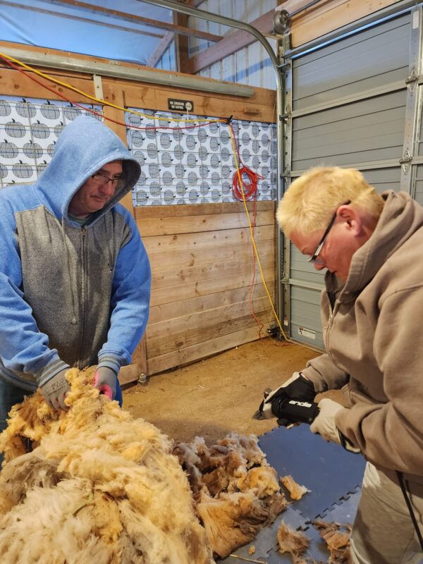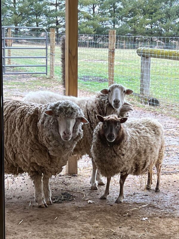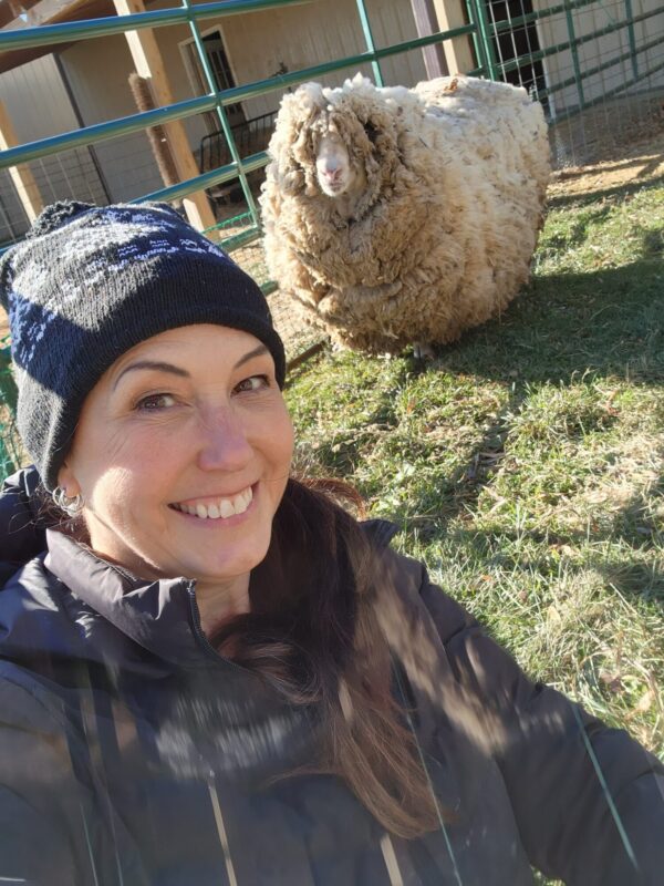 Les tondeurs ont retiré 17 kg de laine à Ellie Mae, lui laissant 5 cm de laine pour la garder au chaud pendant le froid de l’hiver de l’Illinois. Avec les autres moutons, alpagas et lamas de HHFS, Ellie Mae sera entièrement tondue au printemps.
