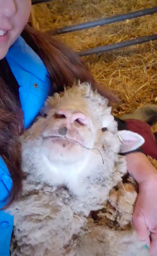 Laura a commencé à passer du temps avec la brebis fraîchement tondue, en s’asseyant à côté d’elle, en la touchant et en la regardant se détendre lentement.