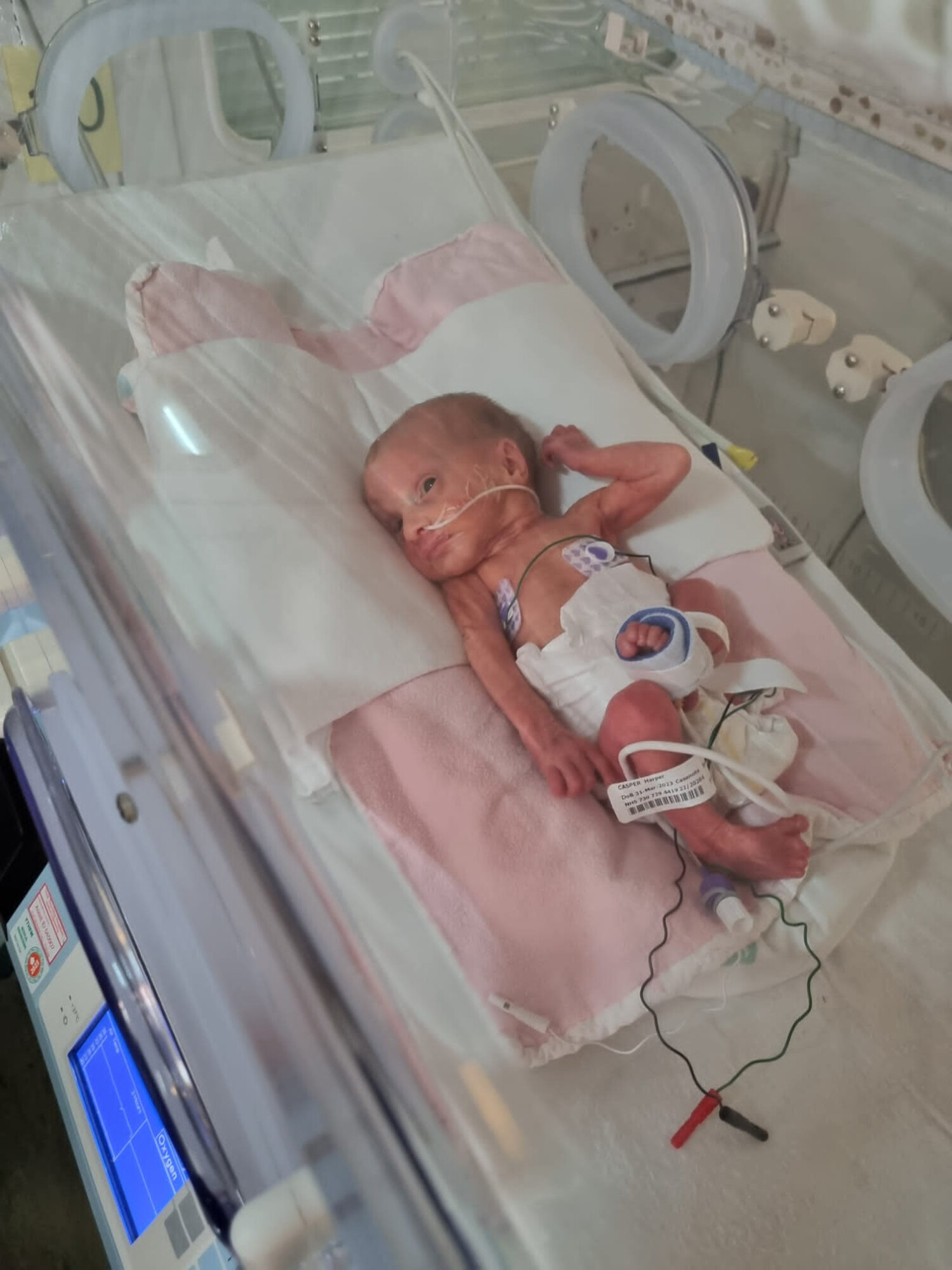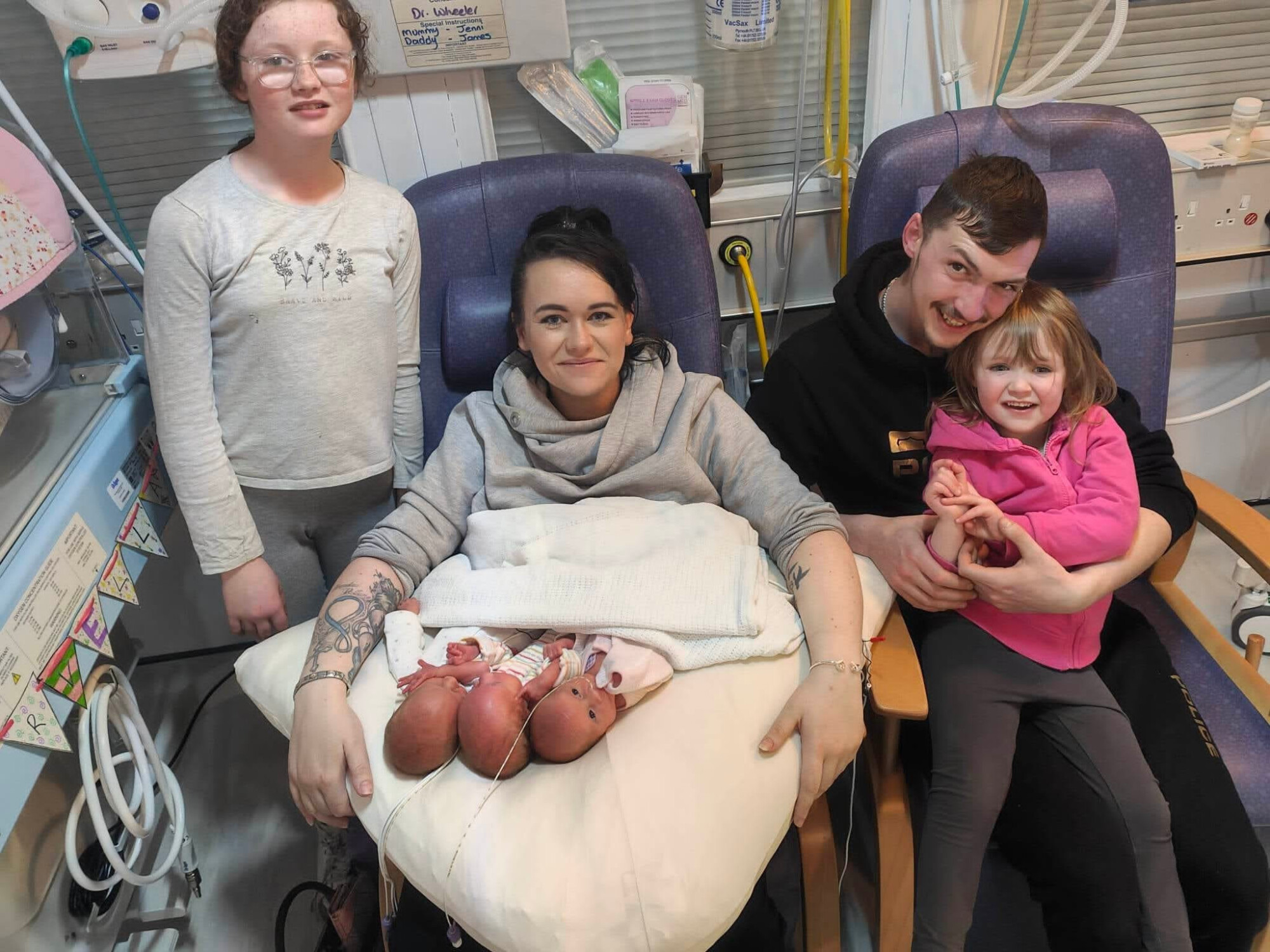 Le 31 mars 2023, les trois petites filles – Harper-Gwen, Marvella et Evalynn – sont nées neuf semaines avant terme, pesant 1,27 kg, 1,38 kg et 1,36 kg.