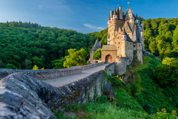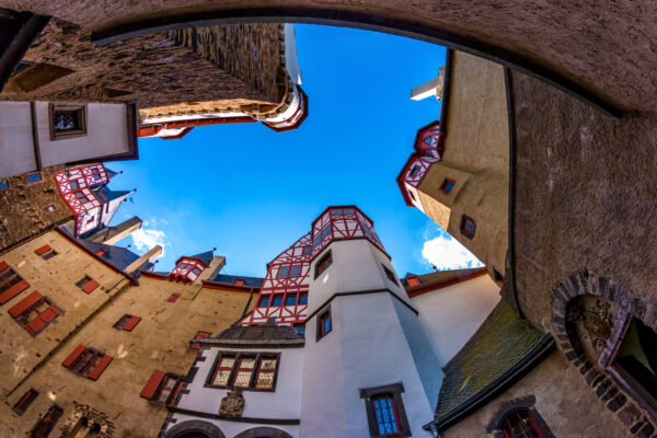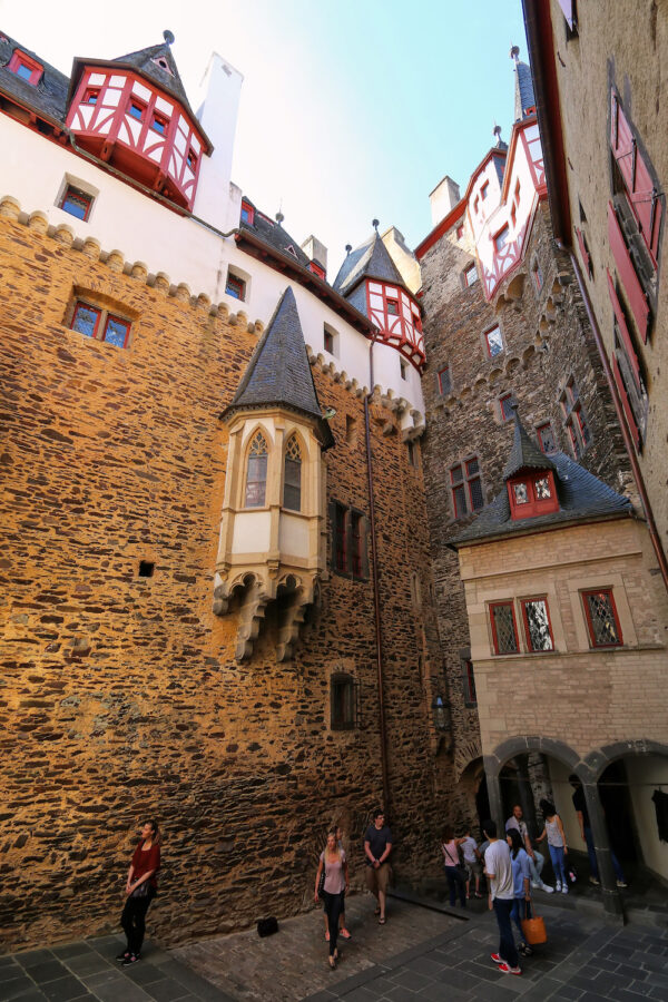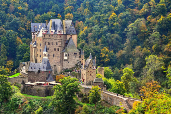 Le château d’Eltz, ou « Burg Eltz », est niché dans les collines surplombant la Moselle, entre Coblence et Trèves, en Allemagne. Depuis sa construction en 1157, il a été la propriété et entretenu par au moins 34 générations de la famille Eltz. Plusieurs meubles d’origine ont été conservés, de même qu’une armurerie, un trésor et une collection d’objets en or et en argent.
