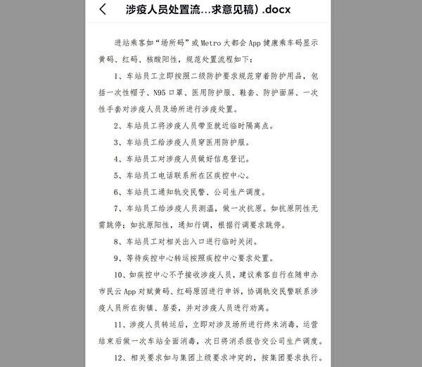 Mme Liang a souligné que le réseau de métro de Shanghai vient d’émettre une circulaire interne sur les mesures de prévention des épidémies. « Le chef de station vient de nous envoyer un document intitulé ‘Procédure de traitement des passagers positifs au Covid-19’. Il détaille les mesures strictes, mais nous ne savons pas quand il sera mis en œuvre. Ils nous ont juste dit de nous préparer à l’application des mesures de contrôle de l’épidémie et de nous familiariser avec ces mesures dès que possible. Ils nous ont informés que si l’épidémie ne peut être contrôlée, la procédure sera probablement mise en application en mars. »