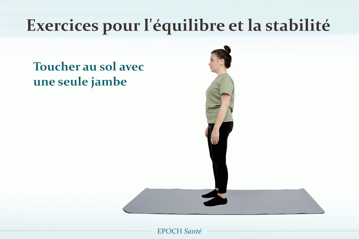 Cet exercice prend la position de la jambe unique et la transforme en un mouvement dynamique de haut en bas, créant ainsi une combinaison puissante pour améliorer l’équilibre. Pour augmenter l’intensité, on peut effectuer cet exercice immédiatement après la position de la jambe unique.