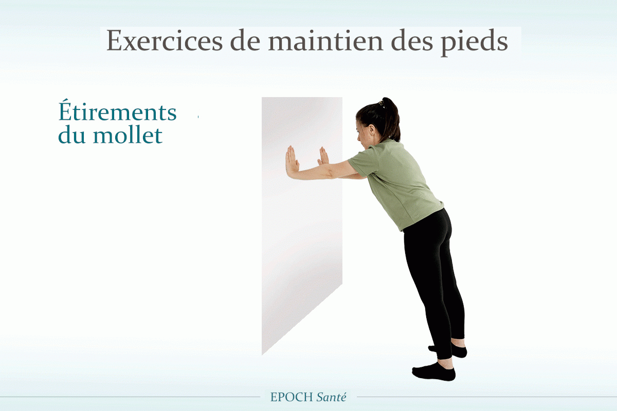 Étape 3 : placer les mains sur le mur et plier les bras avec précaution, en déplaçant la tête vers le mur, tout en gardant les pieds en place et le dos droit. Ne pas plier les genoux. On doit sentir un fort étirement à l’arrière du mollet droit.
