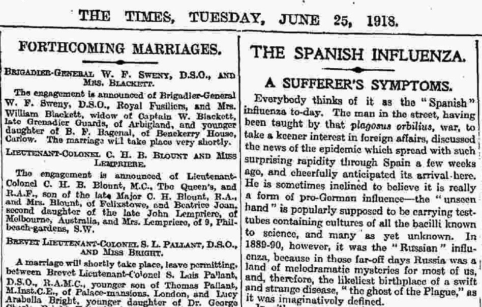 Contrairement à ce que l’on pourrait croire, la grippe espagnole de 1918 n’est pas venue d’Espagne. Elle a reçu ce nom parce que la neutralité de l’Espagne pendant la Première Guerre mondiale a permis à la presse espagnole de rendre compte de l’évolution de la pandémie plus ouvertement que les pays belligérants qui pratiquaient une censure plus stricte. L’Espagne étant le premier pays à rendre compte de l’épidémie, la plupart des pays du monde ont considéré à tort qu’elle était à l’origine de l’infection. (Les Espagnols la nommaient d’ailleurs « la grippe française »).