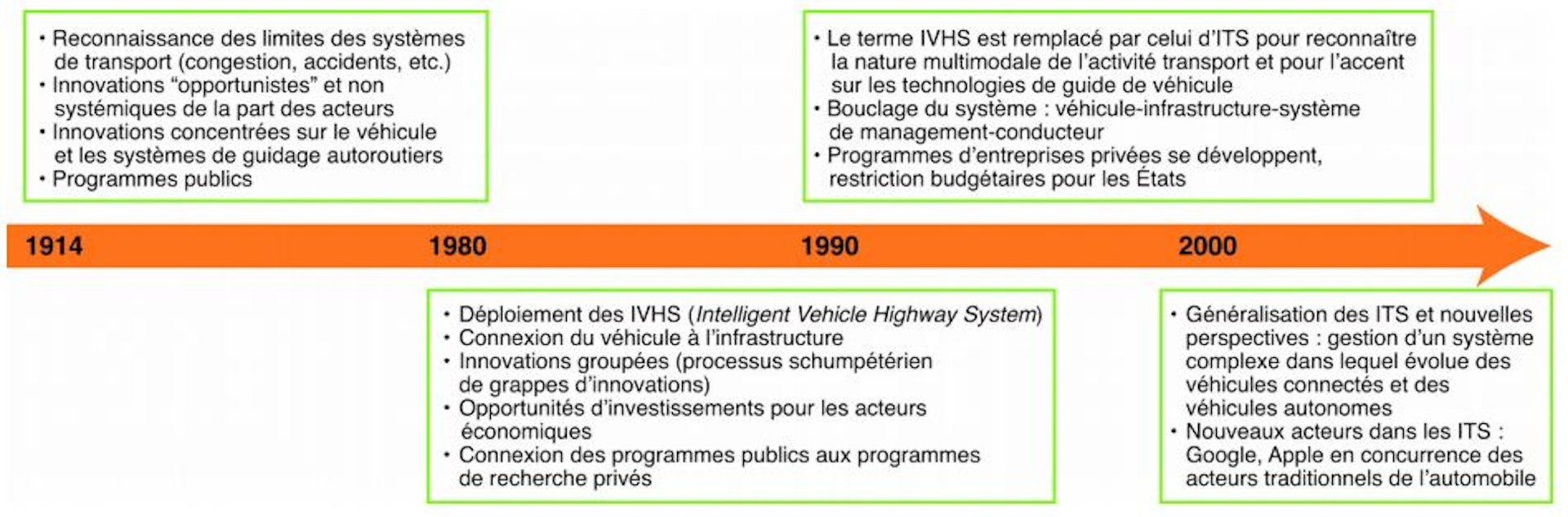 Depuis les années 2000, les ITS se sont généralisés, portés par le processus de digitalisation observé dans les différents segments de l’économie. Les principales transformations ont permis d’améliorer les systèmes d’assistance à la conduite, mais les priorités des acteurs se sont diversifiées. Si la sécurité et les problèmes de congestion restent toujours des vecteurs de développement technologique pour les ITS, les enjeux économiques (réduction de la consommation des véhicules) et environnementaux (baisse des émissions de GES) participent également à la convergence entre le numérique et la gestion du trafic routier. À ce titre, le lancement de l’iPhone en 2007 et la généralisation des smartphones ont accéléré la dynamique des ITS.