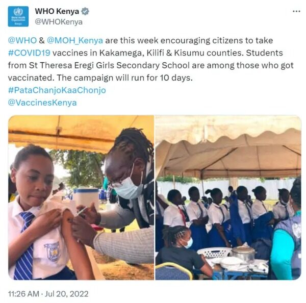 Un autre utilisateur a écrit : « Une coïncidence très intéressante : un an plus tard, près de 100 élèves de l’école St. Theresa Eregi Girls souffrent maintenant d’une maladie mystérieuse », en joignant une photo de l’Organisation mondiale de la santé (OMS) d’une jeune fille se faisant vacciner contre le Covid-19 lors d’une campagne de vaccination de 2022 parrainée par l’agence.