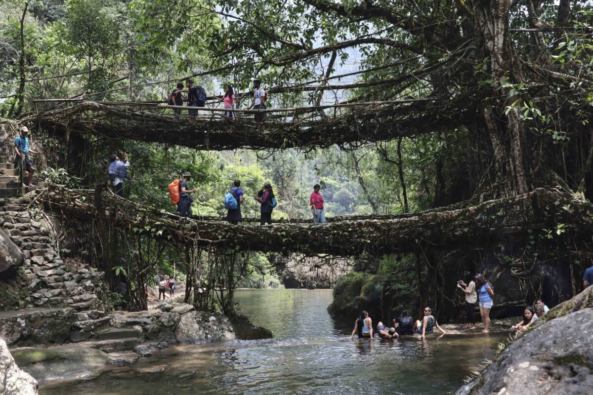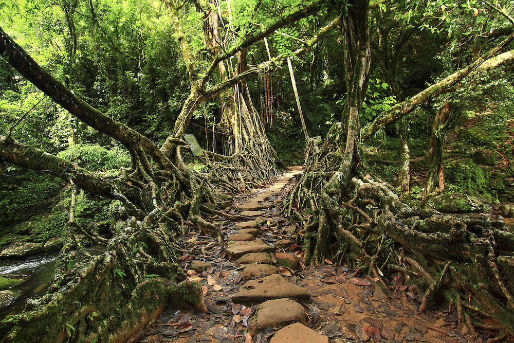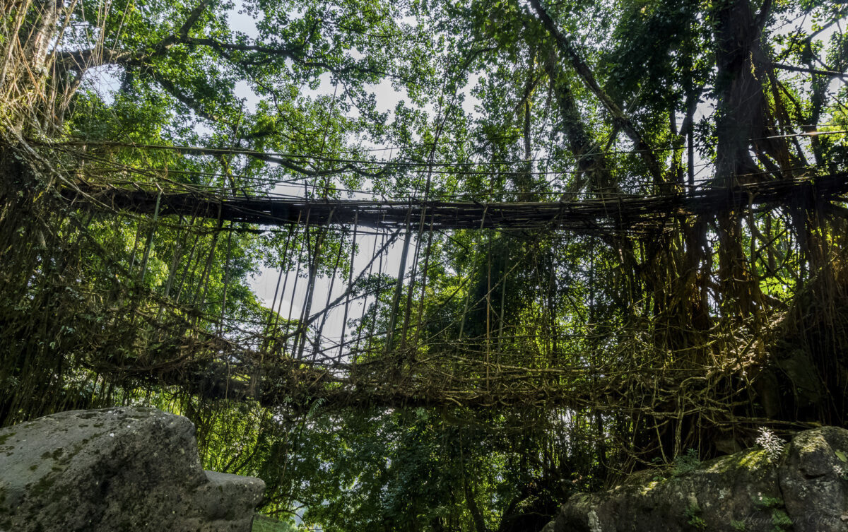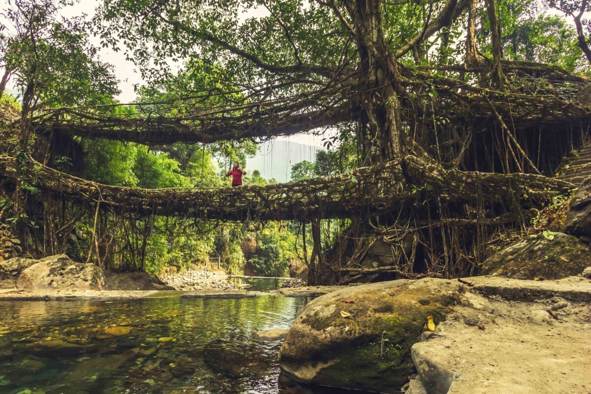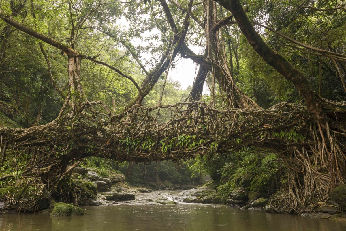 Les ponts de racines vivantes sont courants dans le sud de l’État de Meghalaya, au nord de l’Inde. Ce type de pont suspendu, appelé localement « jing kieng jri », est fabriqué à la main à partir des racines aériennes entrelacées de l’énorme figuier à caoutchouc, Ficus elastica, par les tribus montagnardes Khasi et Jaintia du plateau de Shillong, qui se trouve dans la partie la plus méridionale de la région.