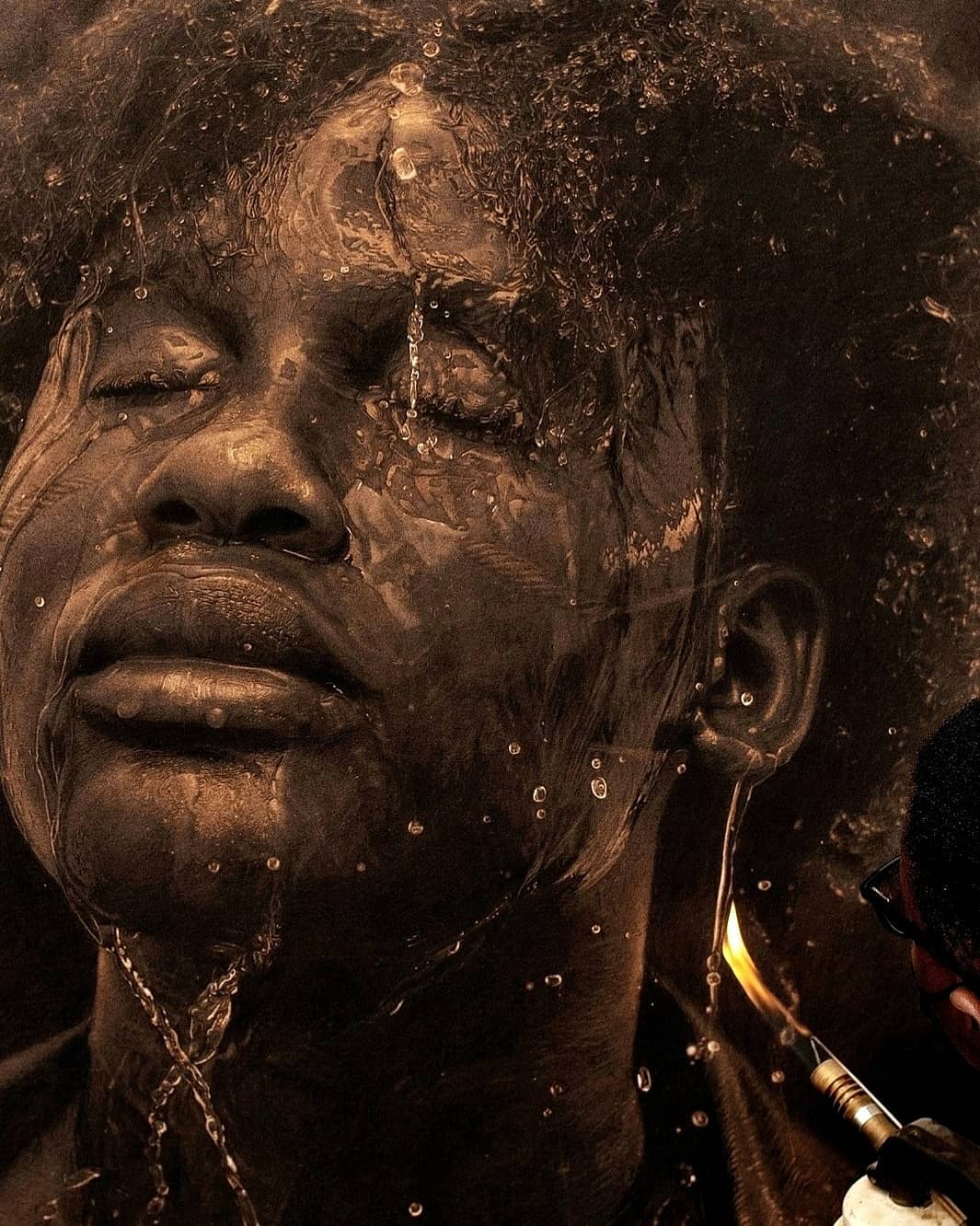 « De la même manière que le feu affine et purifie l’or, il affine et purifie l’art », écrit-il. « C’est ainsi que j’envisage mon processus créatif lorsque je donne vie à mon sujet pour créer une œuvre d’art. »