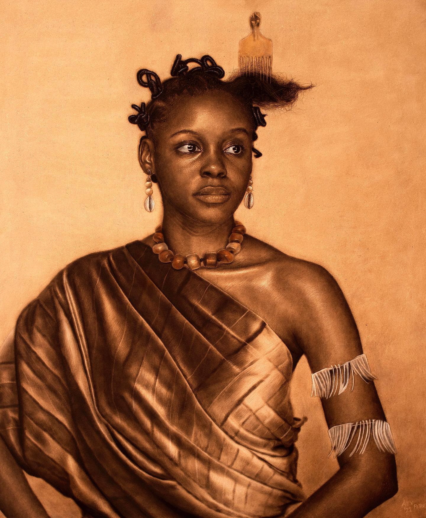 L’œuvre d’art « Isoken » est un portrait au feu et au pastel sur bois qui utilise également un sac de courses « Ghana Must Go » comme matériau pour les chemises des femmes. « L’œuvre parle de la vie et du chemin que nous parcourons. La vie est un voyage et nous sommes un condensé de nos expériences », a-t-il déclaré à Epoch Times.Une autre des œuvres préférées d’Idoko est « Onyoche », un portrait d’une belle femme en habits royaux réalisé avec du feu, des lames et du charbon de bois sur du bois. L’artiste utilise un peigne dans les cheveux de la femme « pour montrer que les Africains étaient en effet capables de produire tout ce dont ils avaient besoin pour faire fonctionner leur société, et qu’ils avaient aussi des accessoires de beauté qui correspondaient à leurs normes de beauté et convenaient à leurs types de peau et de cheveux. »