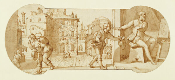 En 1595, plus de 50 ans après le départ de Taddeo pour Rome, son frère cadet Federico décide de composer une série de dessins narratifs (où plusieurs scènes apparaissent dans une seule image pour raconter une histoire) décrivant les premières années de son frère à Rome. La célèbre série de 20 charmants dessins de Federico s’intitule « Les débuts de Taddeo Zuccaro ». Seize d’entre eux illustrent des événements choisis qui ont permis à son frère de devenir un artiste à succès.