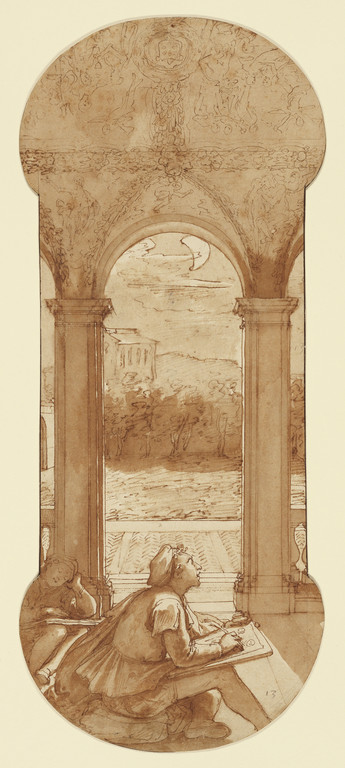 "Taddeo décorant la façade du palais Mattei ", vers 1595, par Federico Zuccaro. Plume et encre brune, pinceau avec lavis brun sur craie noire et quelques touches de craie rouge ; 25 cm par 43 cm. Musée Getty.