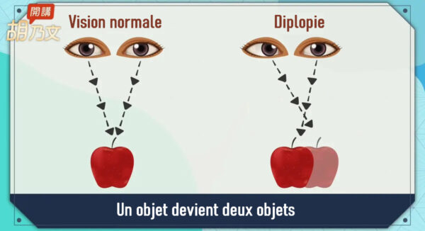 Les problèmes de muscles oculaires peuvent entraîner une diplopie, également connue sous le nom de vision double. La diplopie fait apparaître un même objet sous la forme de deux images distinctes. On distingue deux types de diplopie : la diplopie monoculaire et la diplopie binoculaire. La double vision de haut en bas est appelée diplopie verticale, tandis que la double vision de gauche à droite est appelée diplopie horizontale. Ces classifications indiquent que les muscles responsables de la rotation des yeux peuvent fonctionner de manière incorrecte.