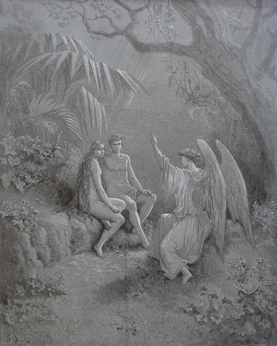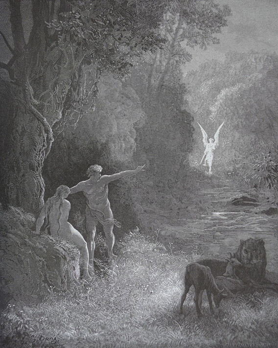 Adam compare l’éclat de Raphaël à une seconde aurore au milieu de la journée. Dans l’illustration de Doré intitulée À l’orient, entre ces arbres, quelle forme glorieuse s’avance par ce chemin ! Adam est représenté penché vers Ève, dans la partie inférieure gauche de la composition. Il montre du doigt Raphaël qui est représenté presque comme une silhouette blanche. Gardez à l’esprit le fait qu’Adam montre du doigt ici, car cela sera pertinent lorsque nous examinerons l’image suivante.