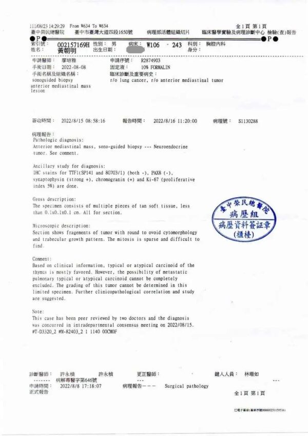 Après avoir subi des examens complémentaires, il a été précisé que la tumeur mesurait environ 8 cm. La tumeur enveloppait les artères principales et le cœur, le risque chirurgical était important. Heureusement, il n’y avait pas de métastases de cellules cancéreuses et les divers indicateurs corporels étaient normaux. Les consultations ultérieures ont permis de diagnostiquer une tumeur médiastinale rare. Des examens complémentaires dans le service d’hématologie et d’oncologie ont confirmé qu’il s’agissait d’une tumeur neuroendocrine.