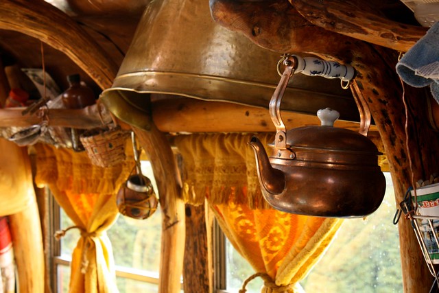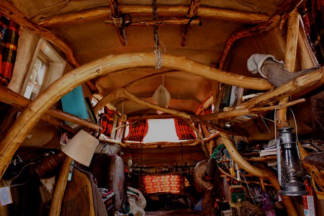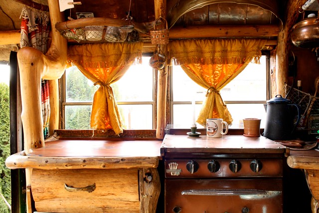 Les meubles ne sont pas des choses banales non plus, ce qui donne à tout l’espace un aspect boisé. Il a sculpté tous les tabourets et les sièges en bois, transformant l’intérieur de cet espace de vie mobile en quelque chose qui ressemble à un croisement entre un hébergement de bûcheron et un cabanon d’arbre magique.