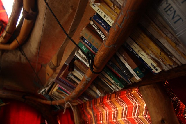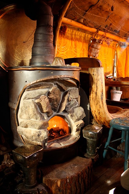 À l’intérieur, il a pensé à tout, ajoutant une étagère au-dessus de son lit – avec un panneau de bois supplémentaire en travers des livres pour les empêcher de glisser lorsque l’autobus bouge et des crochets au-dessus du coin cuisine pour sa petite bouilloire et ses appareils ménagers. Il y a un panneau de bois supplémentaire pour couvrir le poêle lorsqu’il a besoin d’espace supplémentaire dans la cuisine, et même un petit foyer pour les hivers froids pendant qu’il vit dans le Nord.