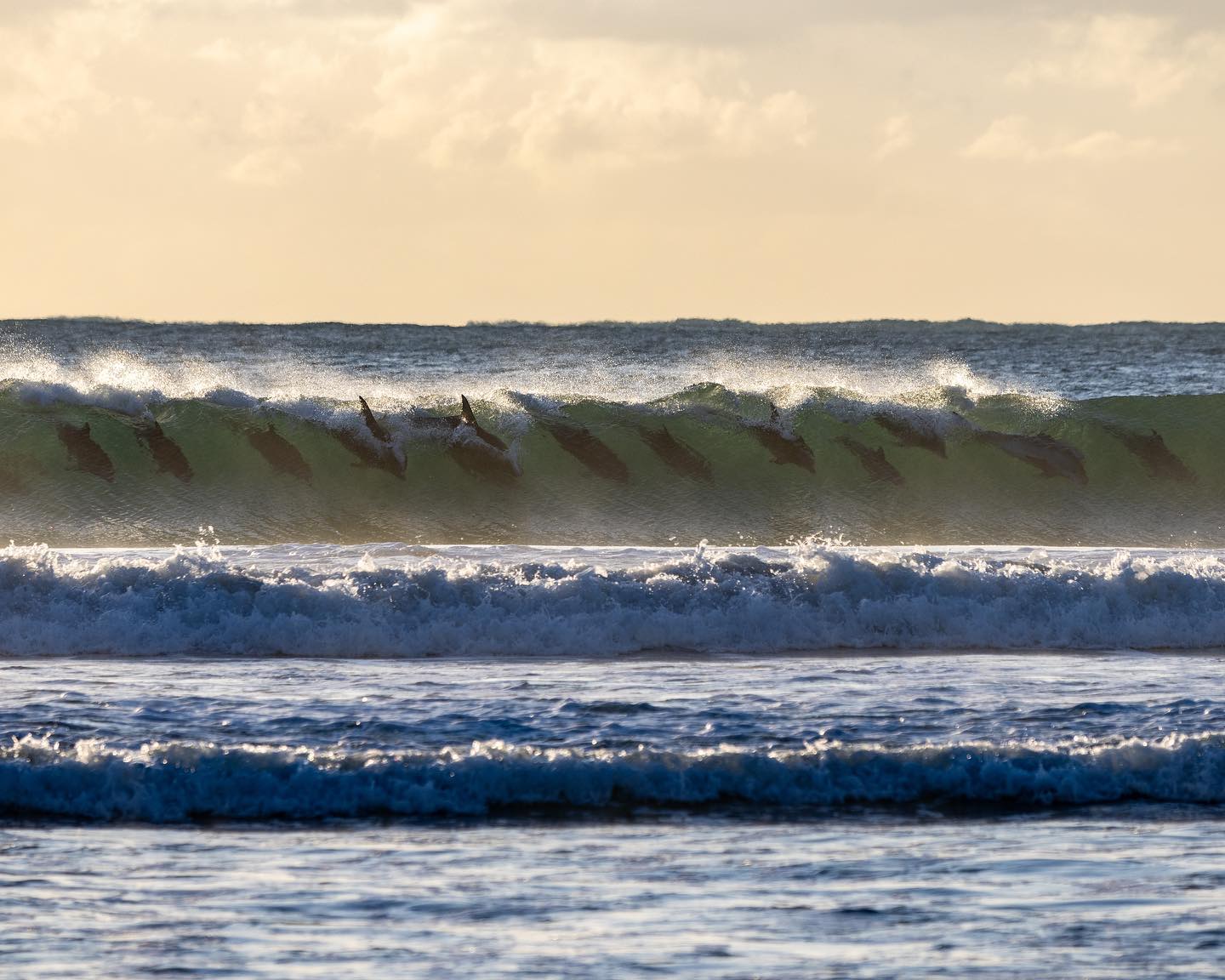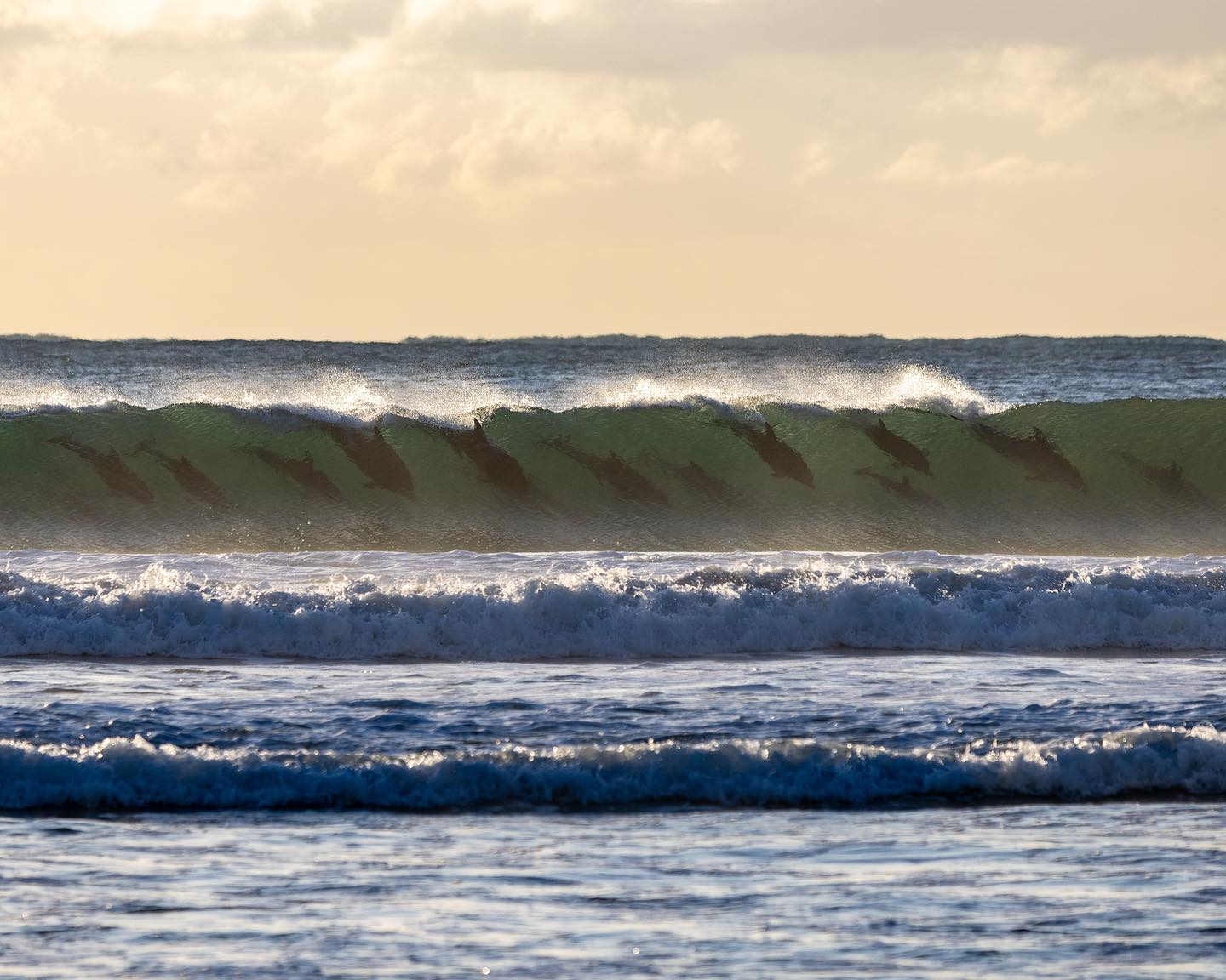 Juste pour s’amuser : des photos rares d’un groupe entier de dauphins surfant en synchronisation sur une vague