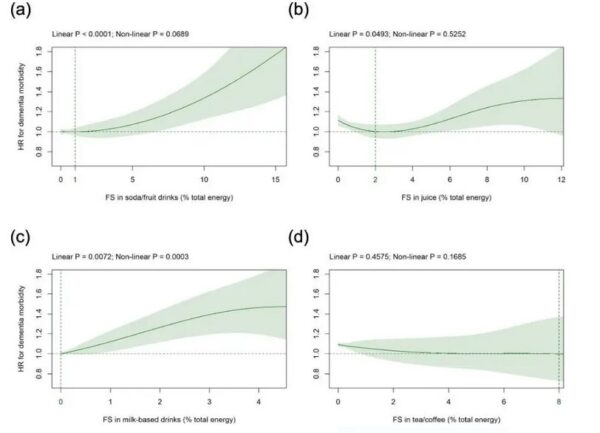 Les résultats ont révélé une association significative en forme de J entre la consommation de sucres libres et de sucres intrinsèques, et le risque de démence. Cependant, l’association entre les sucres libres dans les aliments solides et le risque de démence n’est pas significative. L’évaluation des sous-types de boissons a révélé que les sucres libres contenus dans les sodas, les boissons aux fruits et les boissons à base de lait sont effectivement liés au risque de démence. En revanche, les sucres libres contenus dans le thé et le café n’ont qu’un impact minime sur le risque de démence.