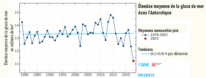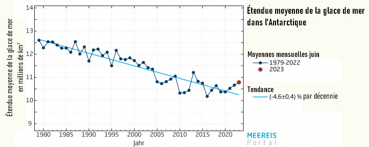 En comparaison à moyen terme – depuis 2013 – l’évolution est de prime abord à la baisse. De 2013 à 2015, les chercheurs ont enregistré à chaque fois des valeurs supérieures à la moyenne en juin, avec un maximum en 2014 d’environ 14,8 millions de km². En 2016 et 2020, la valeur mensuelle se situait exactement au niveau de la moyenne. En juin 2023, avec environ 11,2 millions de km², elle est nettement inférieure.
