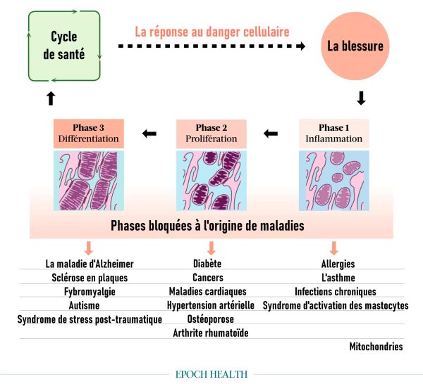 Le Dr Naviaux a conclu qu’il existe un processus en trois phases que les cellules doivent suivre pour guérir d’une blessure. C’est ce qu’il appelle la réaction de danger cellulaire.