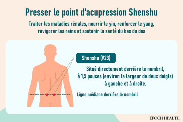 Instructions : placer les paumes des deux mains sur le point Shenshu dans le bas du dos et frotter de haut en bas 36 fois. Cela peut être fait plusieurs fois par jour.
