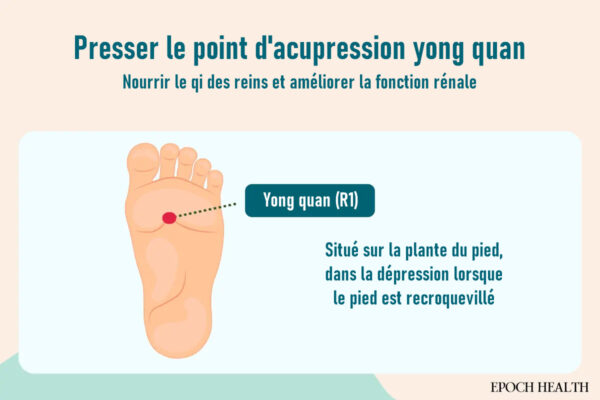 Le point d’acupression Yong quan (R1) situé sur la plante du pied est un point crucial le long du méridien du rein. Un massage régulier de ce point peut nourrir le qi du rein et améliorer la fonction rénale.