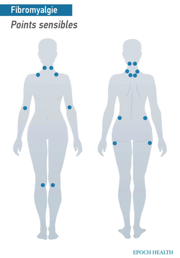 • Points sensibles : également connus sous le nom de points déclencheurs, ce sont des points spécifiques du corps qui, lorsqu’ils sont pressés, provoquent une douleur. La pression peut être aussi douce qu’une étreinte affectueuse. En outre, la pression d’un point sensible peut également déclencher une douleur dans une zone plus large, par exemple dans la jambe, le bras ou le dos. Ces points sont répartis en neuf paires, une de chaque côté du corps, soit un total de 18 points sensibles.