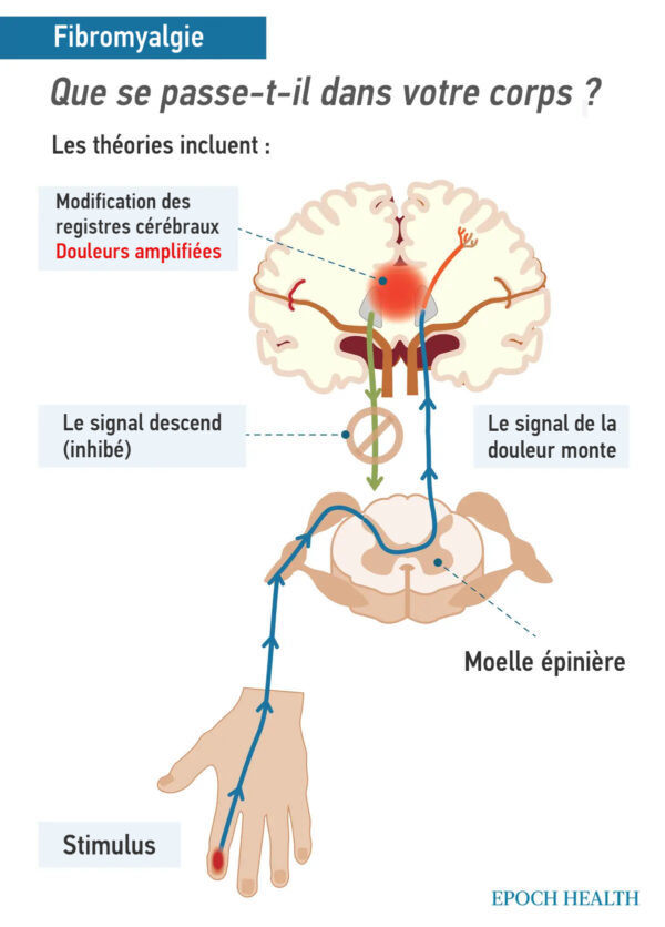 La recherche indique que les personnes atteintes de cette maladie ont une sensibilité accrue à la douleur, ce qui les amène à ressentir de la douleur alors que d’autres personnes ne le feraient pas dans les mêmes circonstances. Des études d’imagerie cérébrale et d’autres recherches ont révélé des changements dans les voies neuronales responsables de la transmission et de la perception de la douleur chez les personnes atteintes de fibromyalgie. La principale théorie qui sous-tend cette affection est que la stimulation nerveuse répétée modifie le cerveau et altère les niveaux de neurotransmetteurs dans le cerveau. Au lieu de s’atténuer avec le temps, les signaux de la douleur s’intensifient, et les récepteurs de la douleur du cerveau se souviennent de la douleur et deviennent excessivement sensibles et réactifs aux signaux de la douleur. Lorsque le cerveau interprète mal ces signaux, il en résulte une douleur chronique.