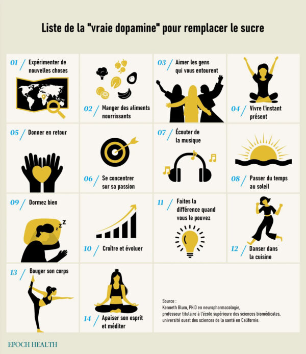 Jessica Russo, psychologue clinicienne à Philadelphie et titulaire d’un doctorat en psychologie, a déclaré à Epoch Times : « tout comme nous le conseillons aux personnes souffrant d’une quelconque addiction, chaque jour, il faut réduire un peu la consommation de sucre. »