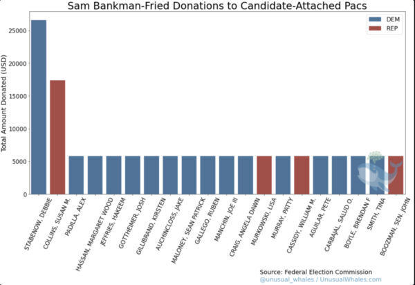Le fondateur de FTX, Sam Bankman‑Fried, ainsi que d’autres cadres supérieurs de FTX, ont distribué plus de 70 millions de dollars à des hommes politiques et des organisations politiques jusqu’aux élections de mi‑mandat de 2022. FTX était le troisième plus grand donateur politique et Bankman‑Fried le deuxième plus grand donateur du Parti démocrate après George Soros.