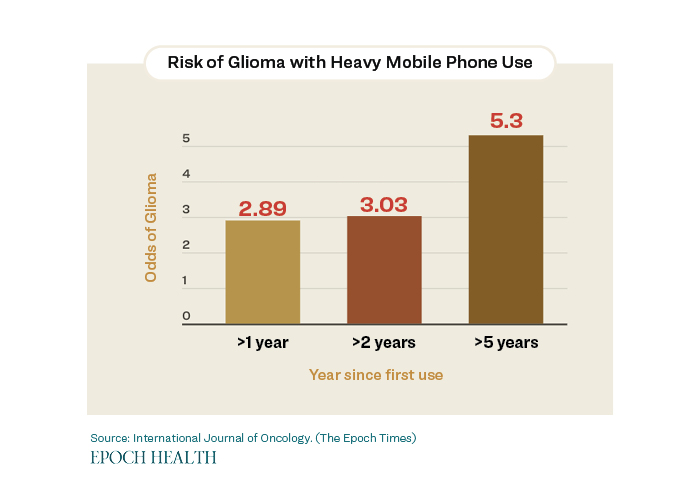 Une étude de 2017 a établi un lien entre l’utilisation ipsilatérale à long terme de téléphones portables et un risque accru de gliome à croissance lente de plus de 40%. Une vaste étude française menée entre 2004 et 2006 a révélé que les personnes utilisant fortement leur téléphone portable présentaient un risque de gliome deux fois plus élevé après plusieurs années d’utilisation.