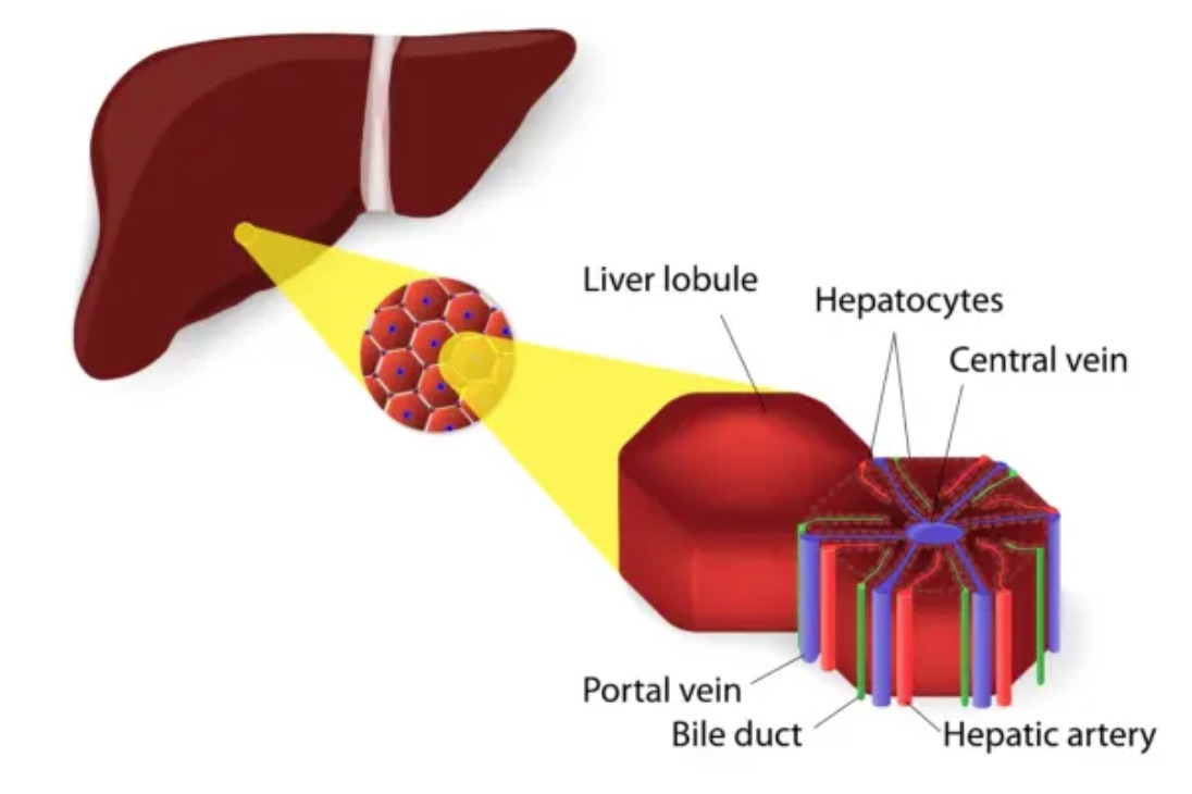 Les lobules du foie, les éléments constitutifs du tissu hépatique, révèlent un autre secret derrière les pouvoirs de régénération de l’organe. Les lobules sont des arrangements hexagonaux d’hépatocytes (cellules du foie) regroupés autour d’une veine centrale. Chaque lobule comporte trois zones aux rôles distincts.