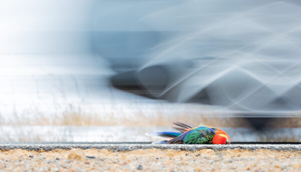 « Les roues d’une voiture passant à toute vitesse devant le corps sans vie d’une belle Rosella occidentale, (Perruche à oreilles jaunes), victime d’une collision avec une voiture », peut-on lire dans la description de la photo prise par Nathan Watson. « Pour tout l’impact que nous, les humains, avons sur les oiseaux, la mortalité routière est peut-être la plus négligée. »