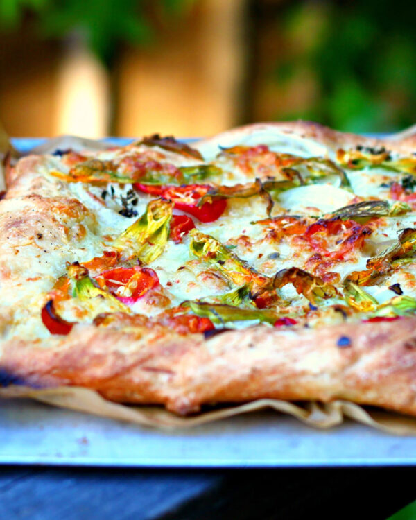 Une option plus légère et plus facile consiste à les faire sauter dans du beurre ou de l’huile d’olive et à les servir avec des pâtes, ou à les ajouter à des quesadillas au fromage et à des plats à base d’œufs. Les fleurs peuvent également être servies crues ; leur saveur est douce et végétale. On peut les ajouter aux salades, les hacher ou les saupoudrer sur les soupes, les ragoûts et les légumes rôtis.Cette recette met en valeur les fleurs de courgettes telles qu’elles sont : éparpillées sur une pizza crémée avec des piments et du fromage. Les fleurs se flétrissent et se carbonisent en rôtissant, créant ainsi une garniture colorée et texturée. Pour préparer la pizza, on peut utiliser une pâte à pizza préparée, mais rien ne vaut la fabrication d’une pâte maison. La recette de pâte incluse ci-dessous est une recette éprouvée. Une fois la pâte préparée, elle peut être utilisée immédiatement, mais si on a le temps, on peut la laissez reposer au réfrigérateur pendant plusieurs heures ou, mieux encore, toute une nuit pour qu’elle soit plus savoureuse. Il s’agit d’une double recette, on peut donc en congeler une pour une utilisation ultérieure. Décongeler la pâte à température ambiante ou pendant une nuit au réfrigérateur.