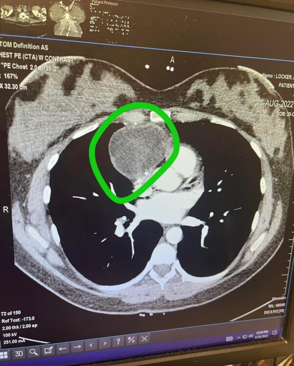 Brittany avait une masse dans la zone située entre ses poumons, le médiastin antérieur, mesurant 7 cm sur 7 cm. Elle pouvait être cancéreuse ou non, ont dit les médecins, qui lui ont conseillé de se faire suivre immédiatement.
