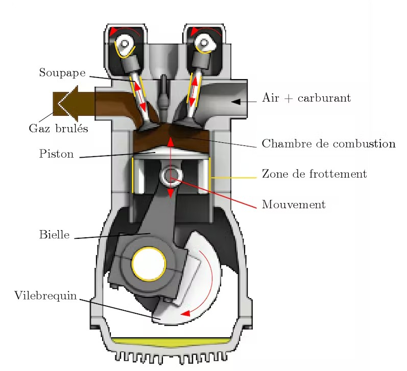 Un moteur thermique est constitué d’une chambre de combustion dans laquelle le carburant est brûlé avec de l’air. Ceci conduit à une augmentation du volume de gaz dans la chambre de combustion qui va pousser un piston vers le bas. Ce dernier est lié à une bielle, elle-même connectée à un vilebrequin qui va transformer le mouvement vertical du piston en rotation. Cette rotation est transmise via la transmission mécanique (notamment la boîte de vitesse) aux roues du véhicule.