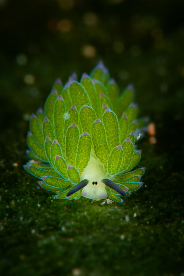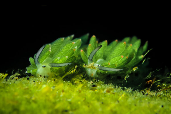 En observant de près l’une de ces curiosités lumineuses, vous verrez une paire d’yeux foncés et deux rhinophores (récepteurs olfactifs et gustatifs ressemblant à des antennes) qui, ensemble, les font ressembler à des moutons. Il n’est donc pas étonnant que les admirateurs préfèrent « moutons de mer » à leur nom officiel, Costasiella kuroshimae, qui est moins accrocheur.