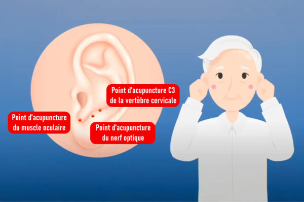 L’acupuncture auriculaire est un traitement de MTC qui consiste à insérer des aiguilles, à fixer de petites pastilles aimantées ou à placer des grains de riz sur des points d’acupuncture spécifiques de l’oreille afin de stimuler les zones correspondantes. Cette approche thérapeutique vise à réguler la circulation du qi et du sang et à traiter divers problèmes de santé. L’oreille contient de nombreux points d’acupuncture liés aux yeux, notamment le point d’acupuncture C3 de la vertèbre cervicale, le point d’acupuncture du nerf optique et le point d’acupuncture du muscle oculaire (comme le montre le diagramme).