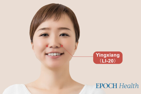 Le point d’acupression Yingxiang est situé près du milieu de l’arête extérieure du nez, à l’intersection des sillons nasogéniens (rides de rire). Presser et pétrir le point Yingxiang des deux côtés avec vos doigts pendant deux à trois minutes à chaque fois.