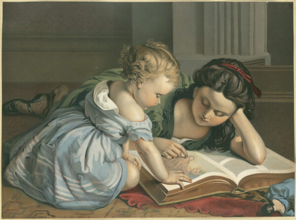 Détail de "The Fair Student (Girl Reading)" (La belle étudiante [lecture des filles]), 1858, par Daniel Huntington.