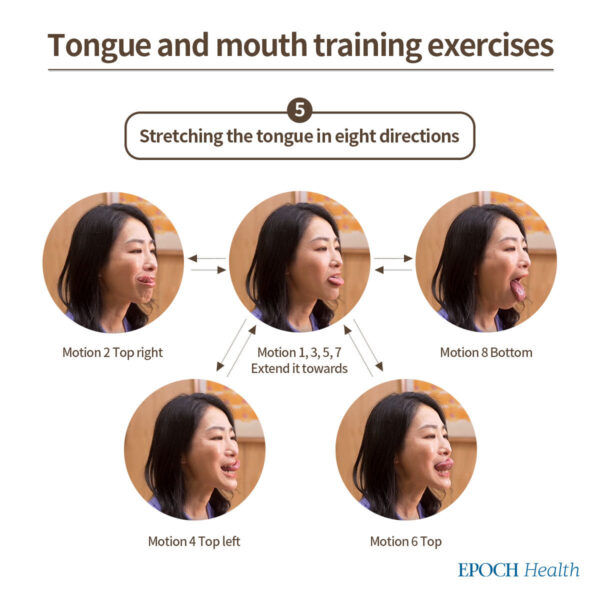 Tendre la langue et l’étendre dans huit directions, en restant dans chaque direction pendant 5 à 10 secondes.