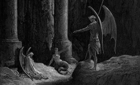 Gustave Doré dépeint la figure de droite comme mi-femme et mi-serpent, ce qui nous indique qu’il s’agit du Péché. Le Péché tend la main à Satan comme si elle communiquait avec lui. L’autre personnage, la Mort, est censé être une forme informe de ténèbres, mais Gustave Doré la représente avec des ailes.