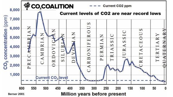 « Contrairement au mantra maintes fois répété stipulant que la concentration actuelle de CO2 est sans précédent, nos niveaux actuels de dioxyde de carbone se situent à des niveaux presque historiques. La concentration moyenne de CO2 au cours des 600 millions d’années précédentes était supérieure à 2600 ppm, soit près de sept fois la concentration actuelle et 2,5 fois le scénario le plus pessimiste prévu par le GIEC pour 2100. Nous n’avons pas trop de CO2, nous n’en avons pas assez », déclare la Coalition CO2.