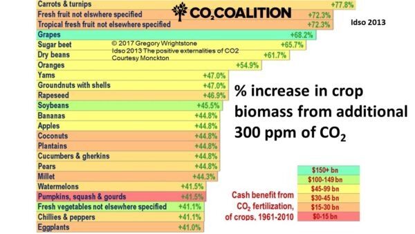 Selon ces experts, dirigés par le prix Nobel de physique John Clauser, « une augmentation des concentrations de CO2 de 300 ppm augmentera la croissance des plantes de 46% en moyenne » dans 83 types de cultures vivrières, comme le montrent les résultats de 270 études en laboratoire.